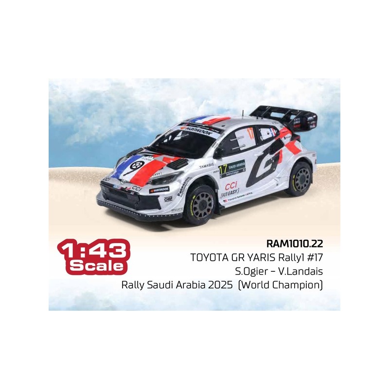 Miniature diecast rally 1/43 de la Toyota GR Yaris Rally1 n 17 pilotée par S. Ogier - V. Landais au Rallye d'Arabie Saoudite 2025. World Champion. Modèle réduit de voiture de rallye IXO RAM1010. Catalogue Miniatures automobile IXO 2026. Maquette auto de collection.