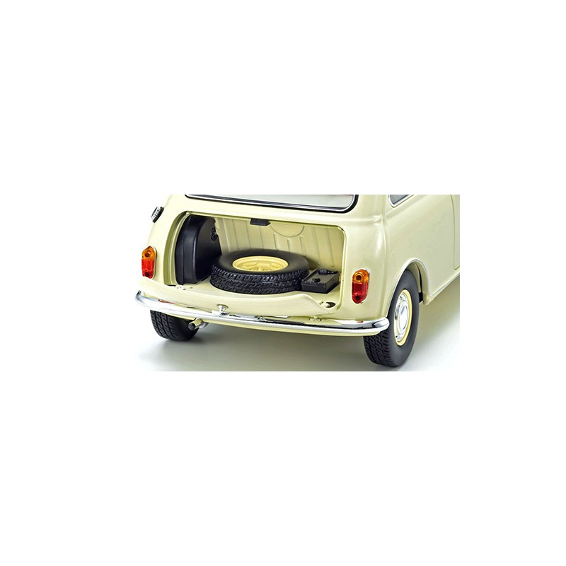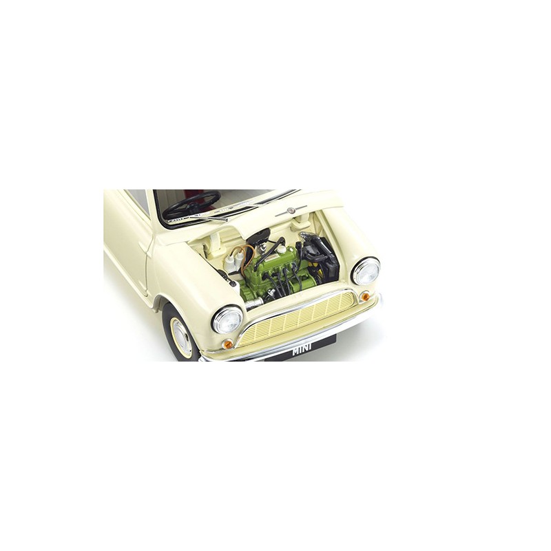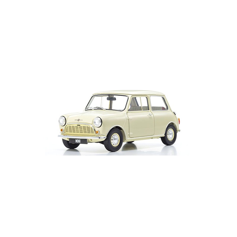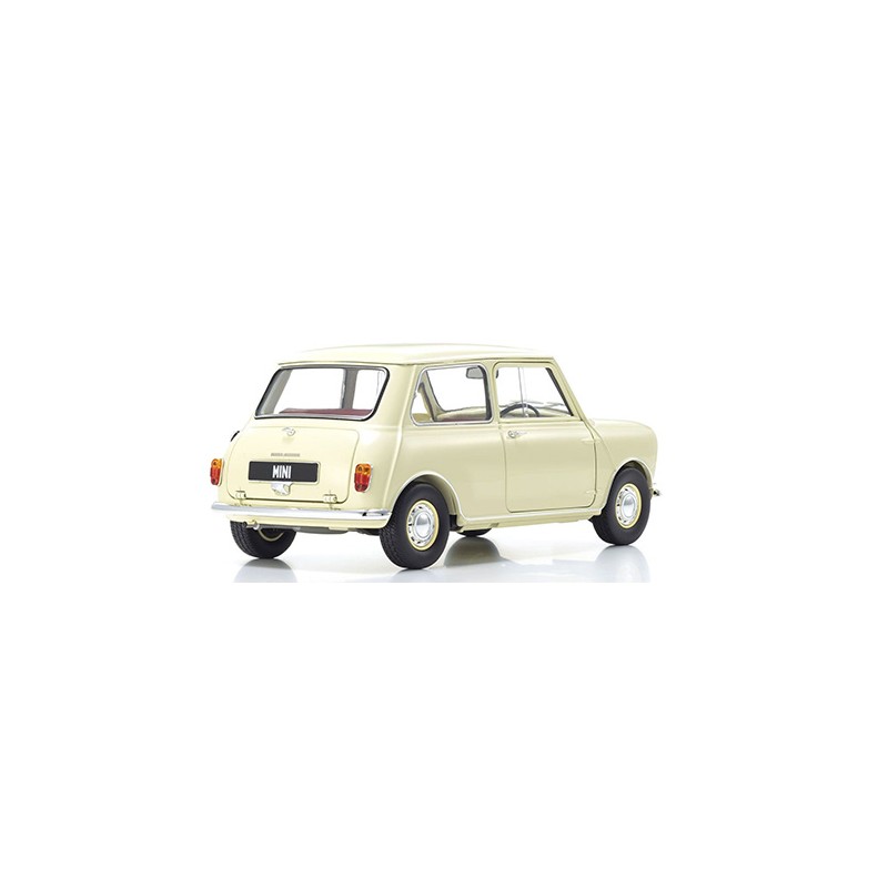 Miniature diecast car 1/18 de la Morris Mini Minor année 1964 couleur Old English White. Modèle réduit de voiture Kyosho 08964W. Catalogue Miniatures automobile Kyosho 2023. Maquette auto de collection.