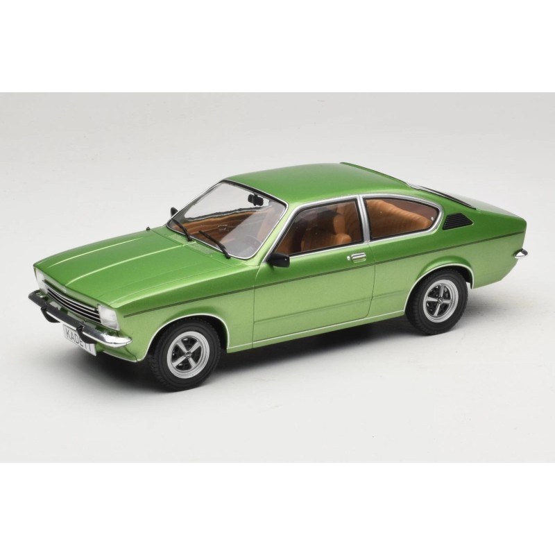 Miniature diecast car 1/18 de l'Opel Kadett C Coupe année 1975 couleur Green. Modèle réduit de voiture MCG MCG18599. Catalogue Miniatures automobile MCG 2025. Maquette auto de collection.