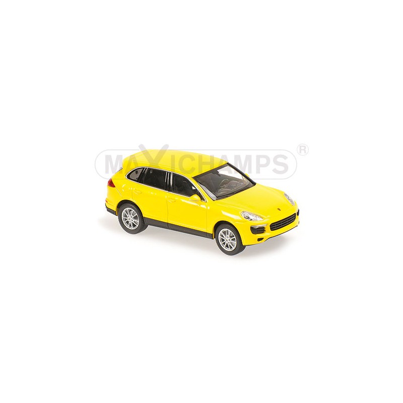 Miniature diecast 1/43 de la Porsche Cayenne année 2014 de couleur Jaune. Modèle réduit de voiture Minichamps 940063201. Maquette auto de collection gamme Maxichamps.