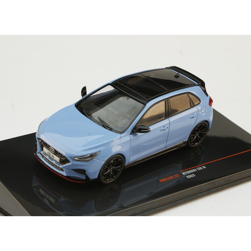 Miniature diecast car 1/43 de la Huyndai i30 N année 2022 couleur Light Blue. Modèle réduit de voiture IXO MOC335. Catalogue Miniatures automobile IXO 2024. Maquette auto de collection.