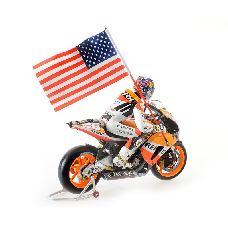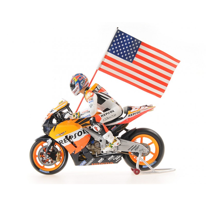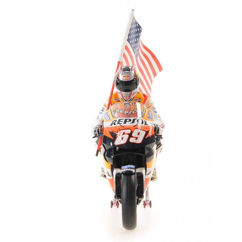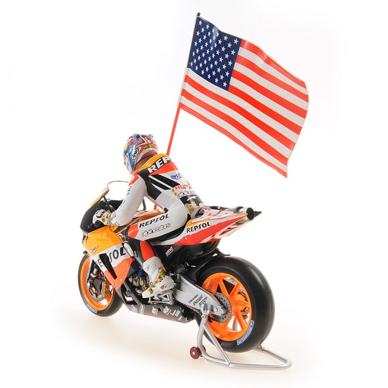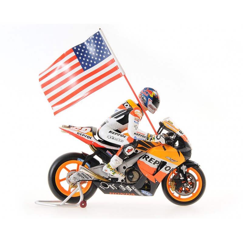 Miniature diecast bike 1/12 de la Honda RC211V de Nicky Hayden lors de son titre de champion du monde en Moto GP en 2006. Set Bike with figurine and flag. Modèle réduit de moto Minichamps 122061169. Maquette moto de collection.