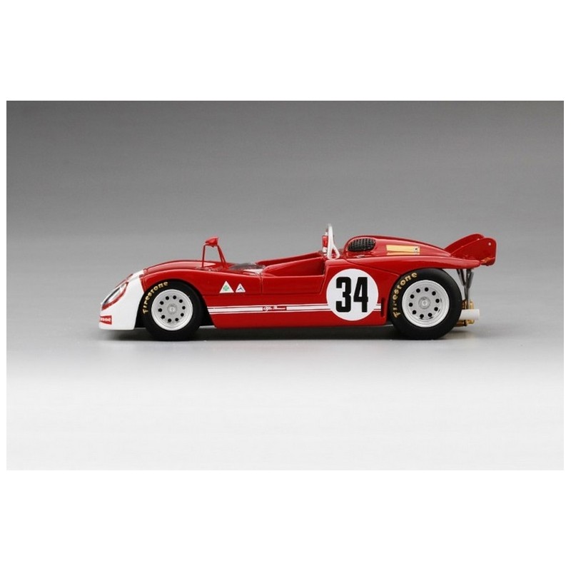 Miniature diecast racing 1/43 de la Alfa Romeo 33/3 n 34 pilotée par Vaccarella - Hezemans lors des 12 Heures de Sebring en 1971. Modèle réduit de la voiture Truescale TSM154311. Maquette auto de collection.