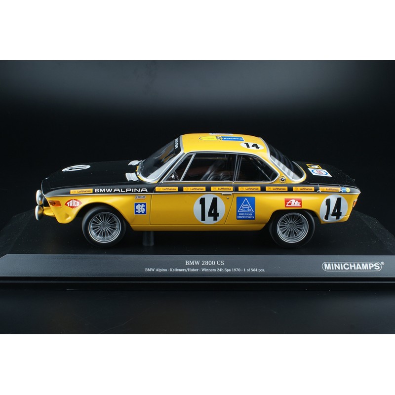 Miniature diecast car racing 1/18 de la BMW 2800 CS n 14 pilotée par Huber - Kelleners lors des 24 Heures de Spa Francorchamps 1970. Winner. Modèle réduit de voiture Minichamps 155702714. Miniature BMW automobile du catalogue Minichamps 2018. Maquette 24h auto de collection.