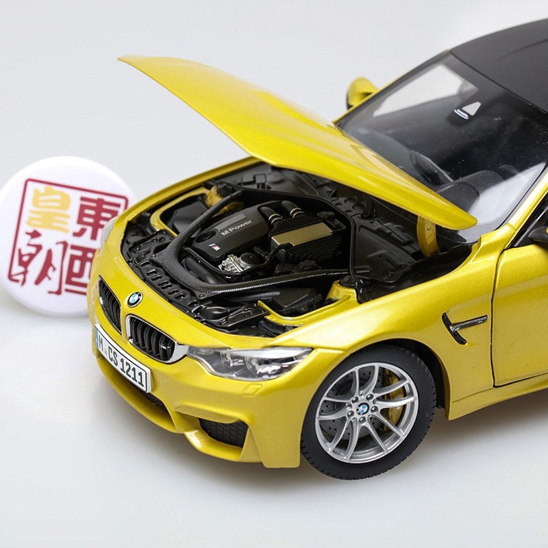 Miniature diecast car 1/18 de la BMW M4 Coupe Jaune de 2017. Modèle réduit voiture Paragon 97103. Maquette auto de collection.