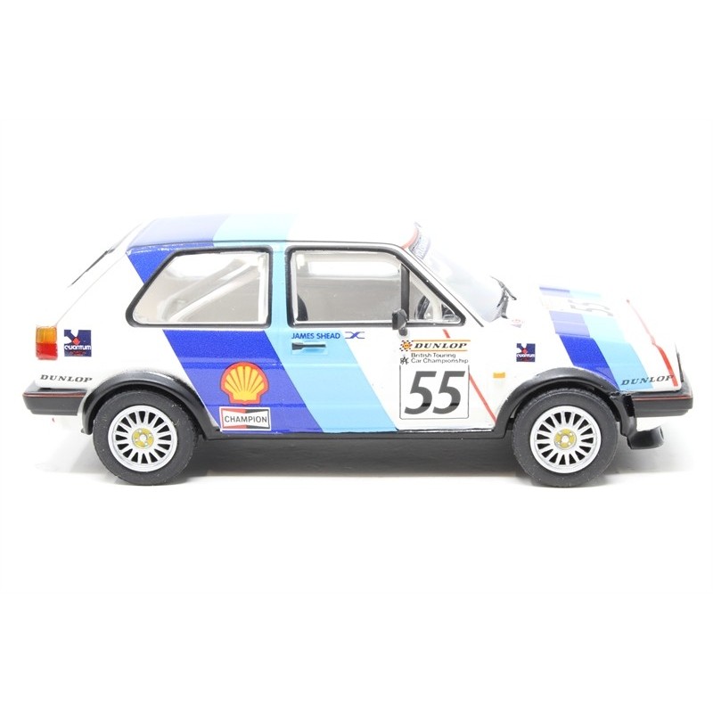 Miniature diecast car racing 1/43 de la VW Golf GTI 16v MK2 n 55 pilotée par James Shead en BTCC en 1988. Modèle réduit de voiture Corgi VA13601. Catalogue Miniatures automobile Corgi. Maquette auto de collection.
