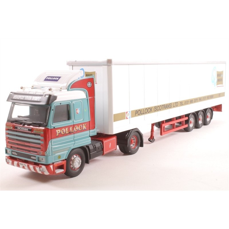 Miniature diecast car 1/50 de la Scania 143 Box Trailer Pollock (Scotrans) LTD Bathgate, Scotland L.E.. Modèle réduit de voiture Corgi CC14806. Catalogue Miniatures automobile Corgi. Maquette auto de collection.