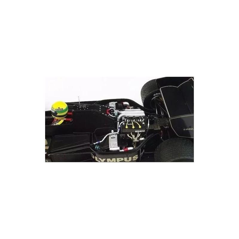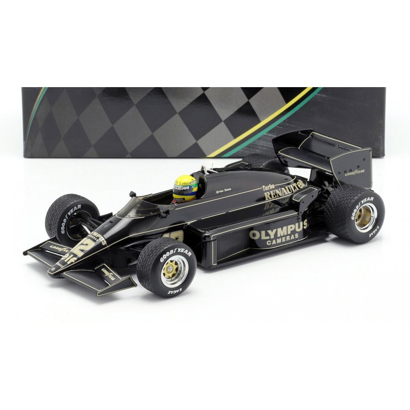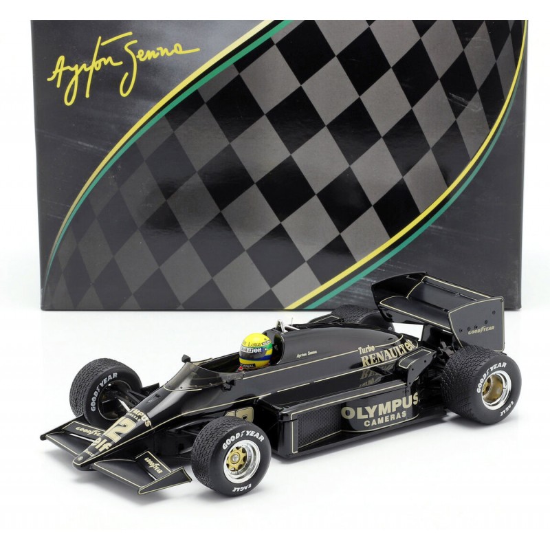 Miniature diecast F1 1/18 de la Lotus Renault 97T pilotée par Ayrton Senna lors de sa victoire au Grand Prix du Portugal de Formule 1 1985. Modèle réduit de voiture IXO SENR18001. Maquette auto de collection.
