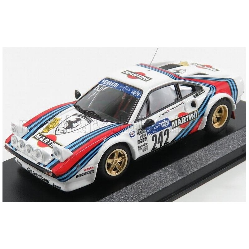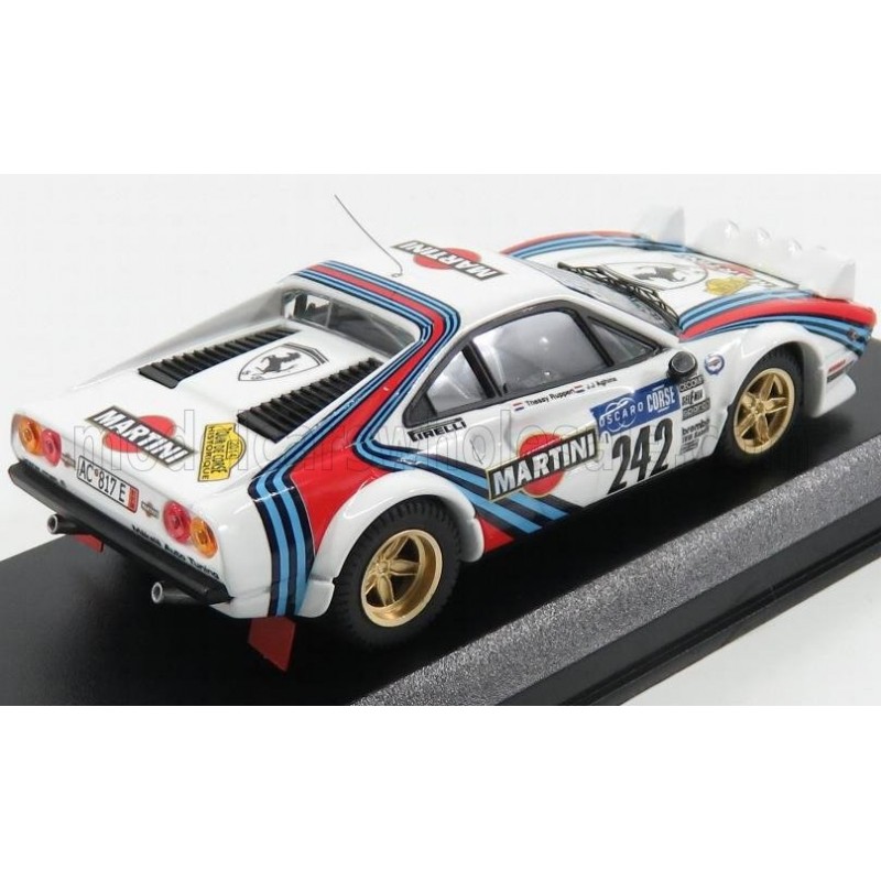 Miniature diecast rally 1/43 de la Ferrari 308 GTB Gr4 night version n 242 pilotée par Aghina - Ruppert au Rallye Tour de Corse Historique 2014. Modèle réduit de voiture de rallye Best Model 9674. Catalogue Miniatures automobile Best Model 2021. Maquette auto de collection.