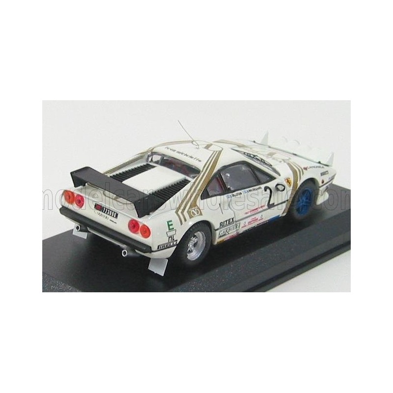 Miniature diecast rally 1/43 de la Ferrari 308 GTB n 2 pilotée par Waldegaard - Thorzelius au Rallye de Monza 1984. Modèle réduit de voiture de rallye Best Model 9354. Catalogue Miniatures automobile Best Model 2021. Maquette auto de collection.