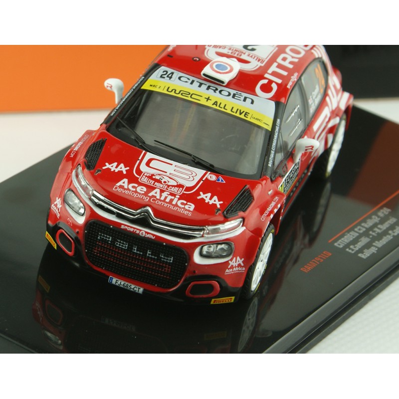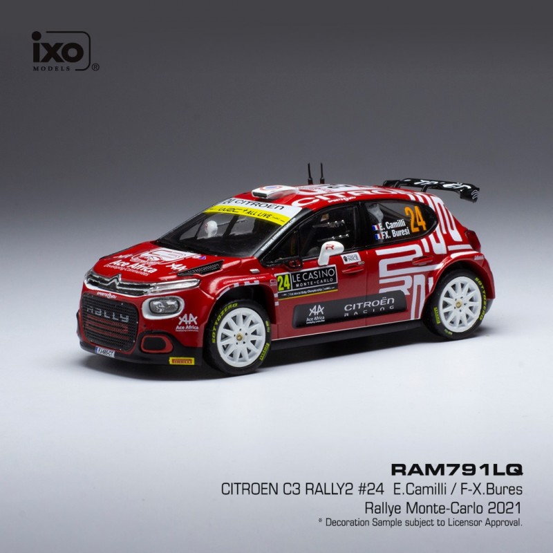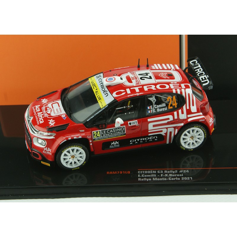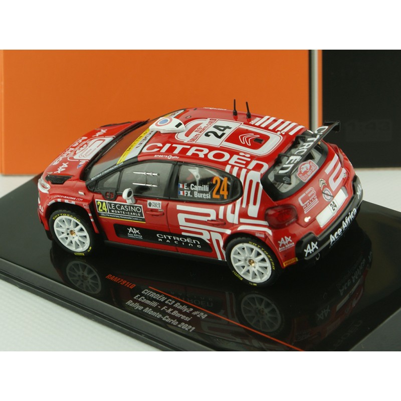 Miniature diecast rally 1/43 de la Citroen C3 Rally2 n 24 pilotée par Camilli - Buresi au Rallye Monte Carlo 2021. Modèle réduit de voiture de rallye IXO RAM791. Catalogue Miniatures automobile IXO 2021. Maquette auto de collection.