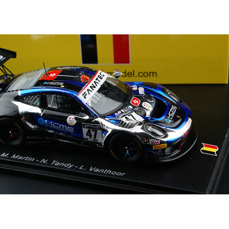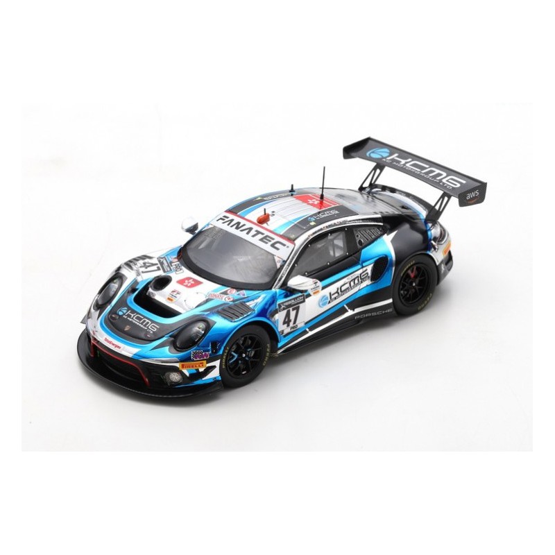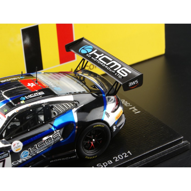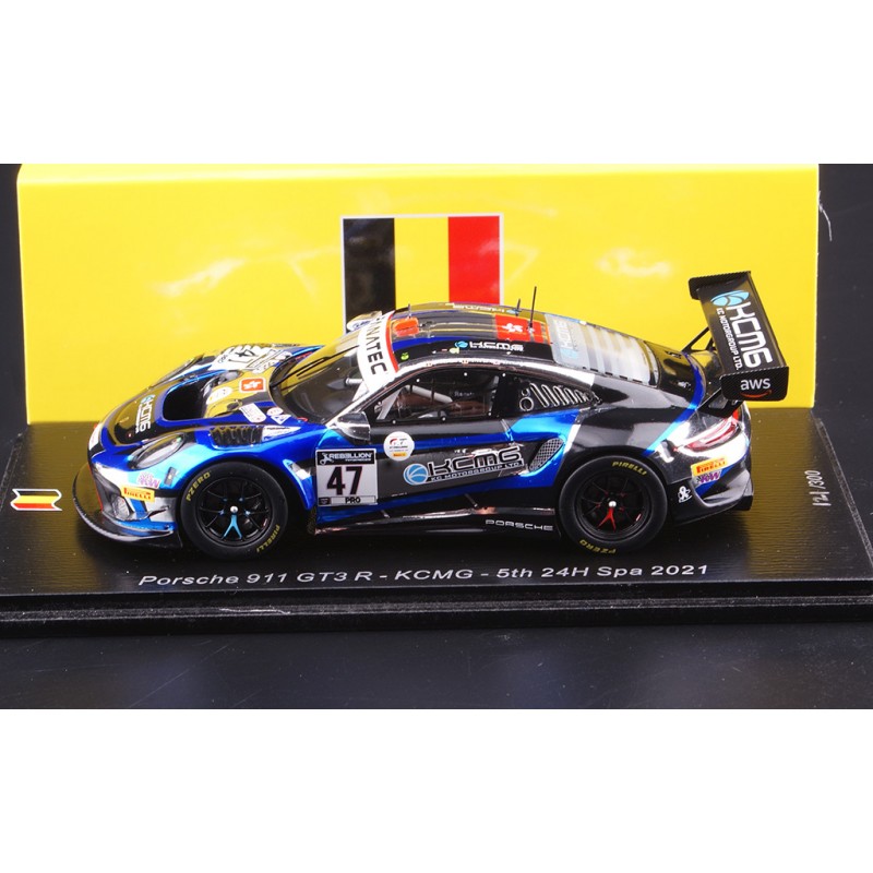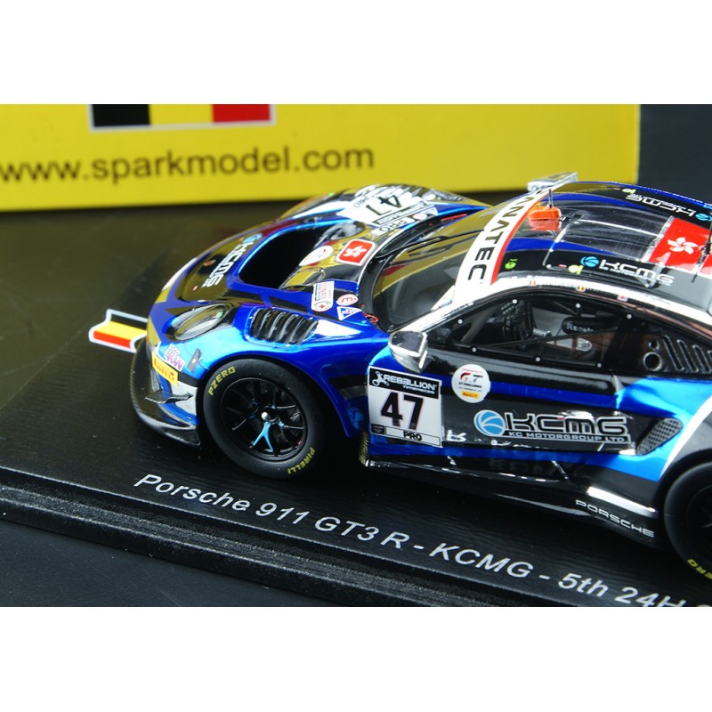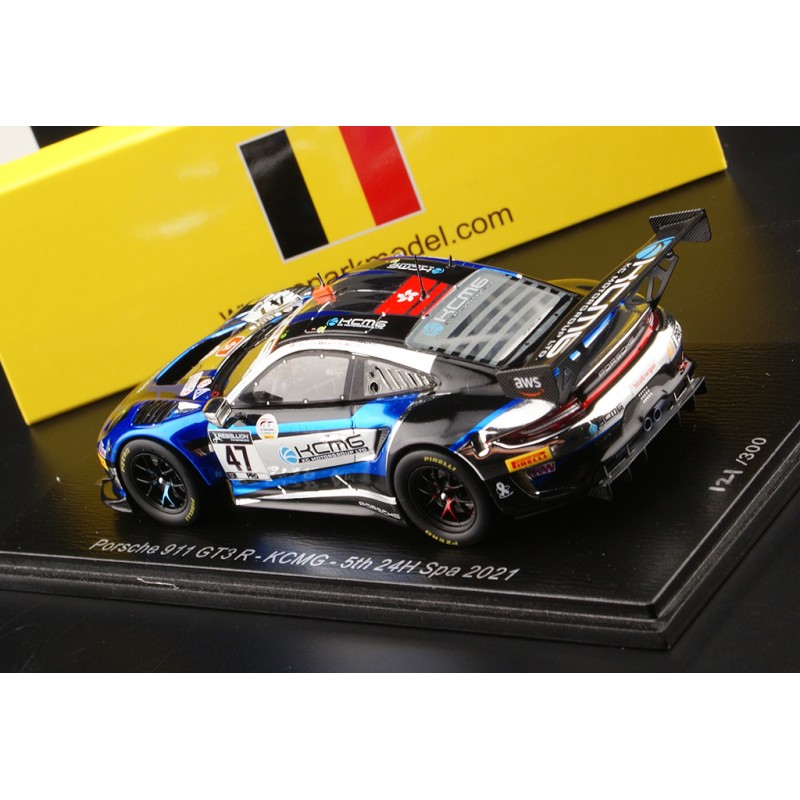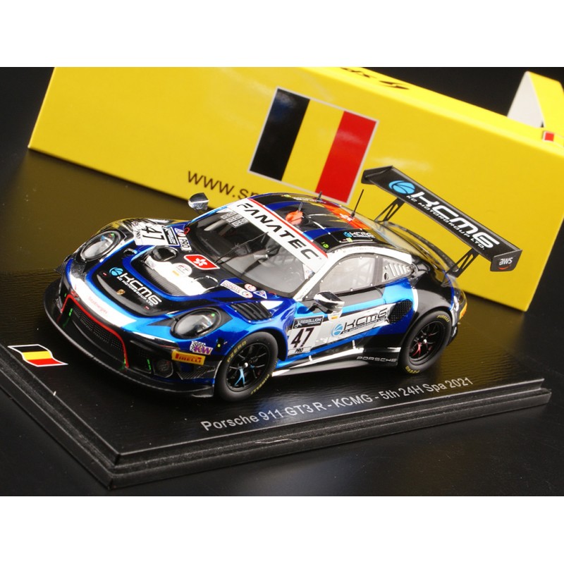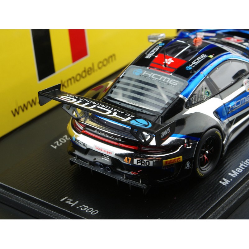 Miniature diecast car racing 1/43 de la Porsche 911 GT3 n 47 KCMG pilotée par Martin - Tandy - Vanthoor aux 24 Heures de Spa Francorchamps 2021. 5th. Limited Edition 300 pcs. Modèle réduit de voiture Spark SB433. Catalogue Miniatures automobile Spark 2021. Maquette auto de collection.