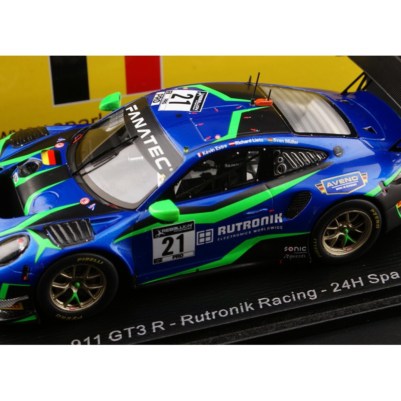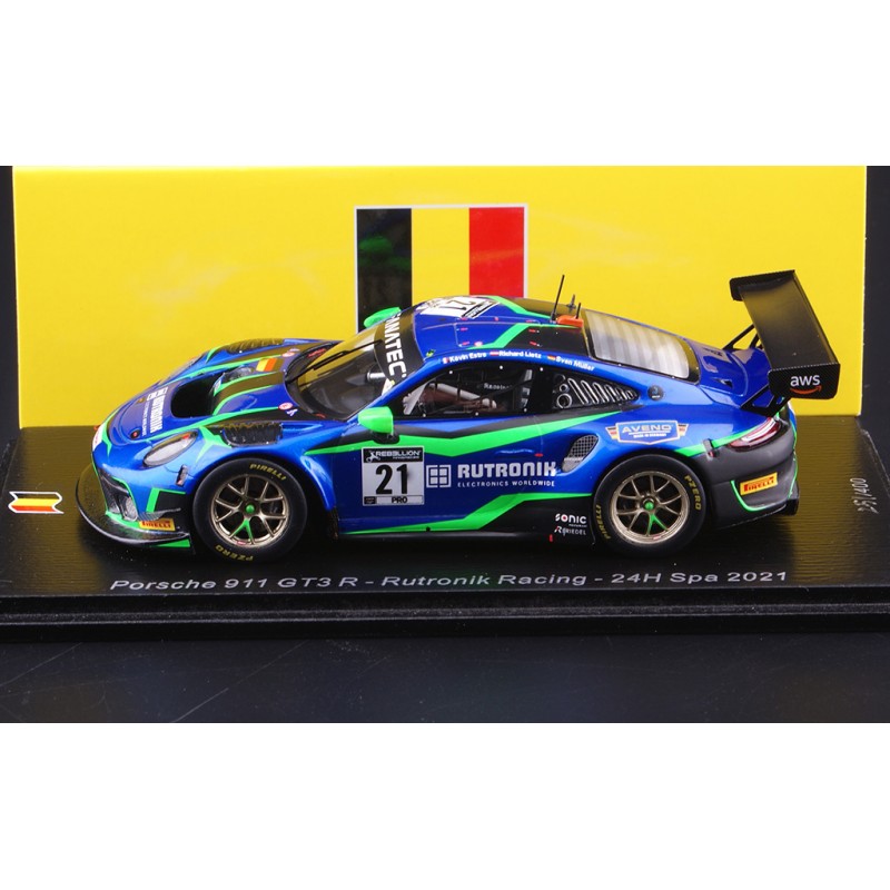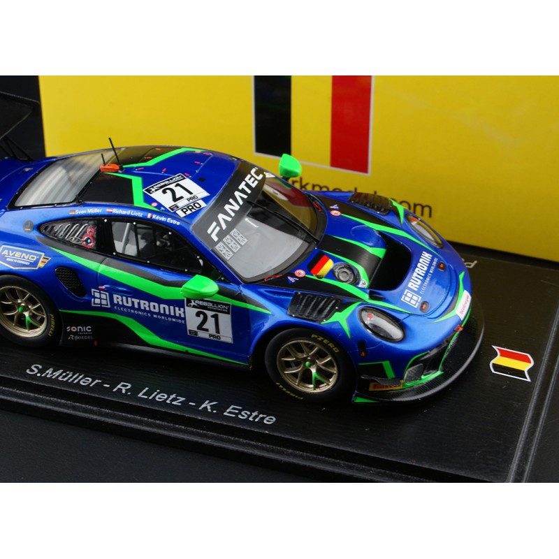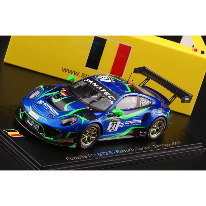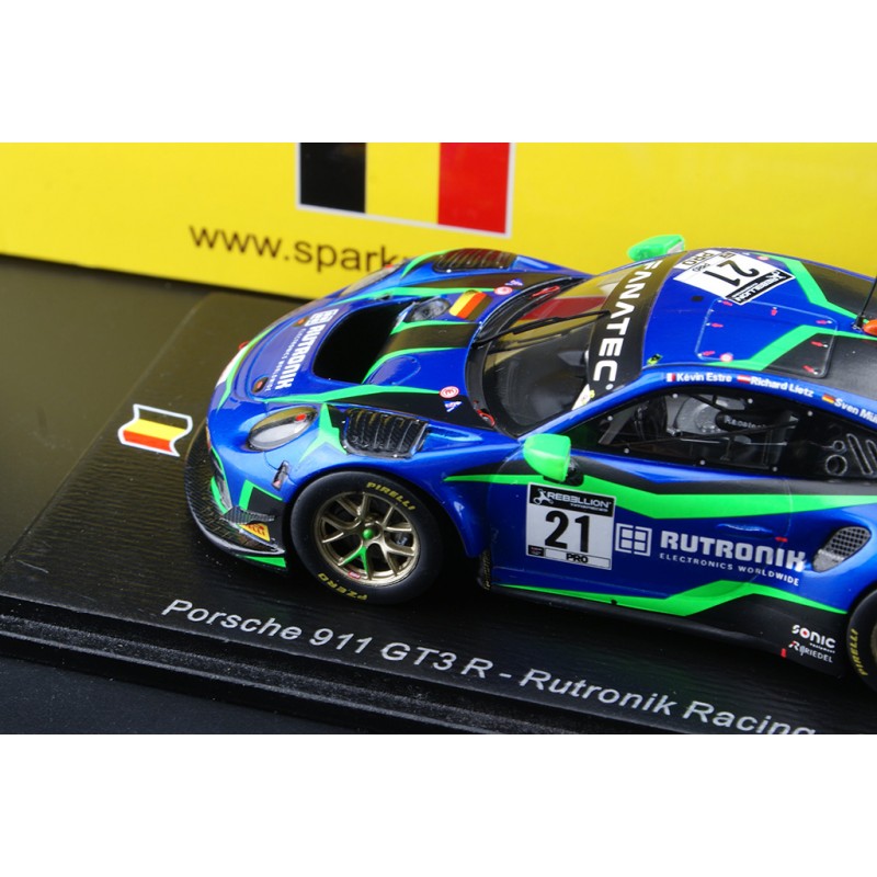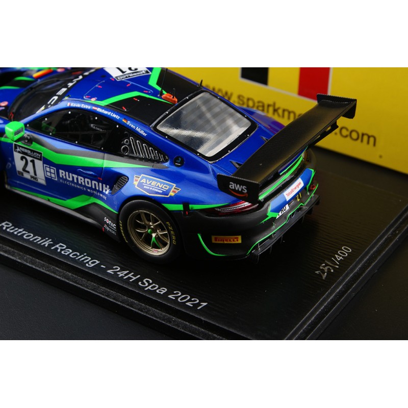 Miniature diecast car racing 1/43 de la Porsche 911 GT3 R n 21 Rutronik Racing pilotée par Muller - Lietz - Estre aux 24 Heures de Spa Francorchamps 2021. Limited Edition 300 pcs. Modèle réduit de voiture Spark SB479. Catalogue Miniatures automobile Spark 2021. Maquette auto de collection.