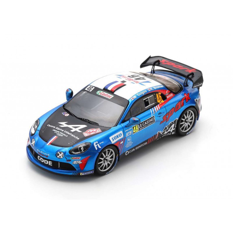 Miniature diecast rally 1/43 de la Alpine A110 n 46 pilotée par Guigou - Bronner au Rallye Monte Carlo 2022. Modèle réduit de voiture de rallye Spark S6698. Catalogue Miniatures automobile Spark 2022. Maquette auto de collection.