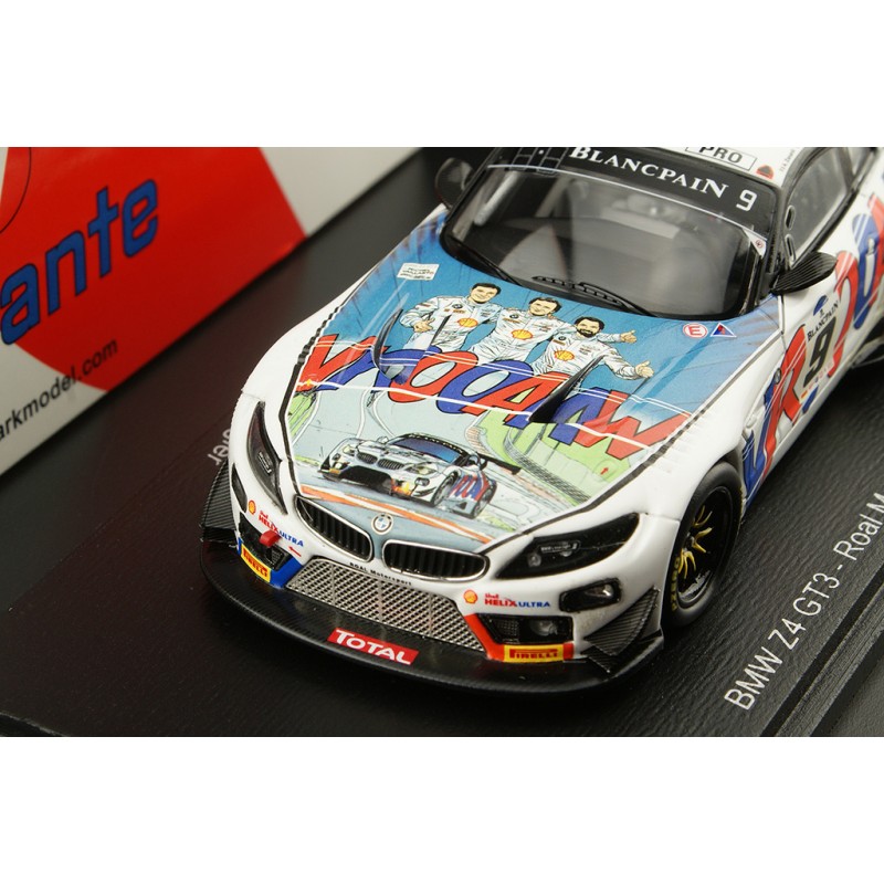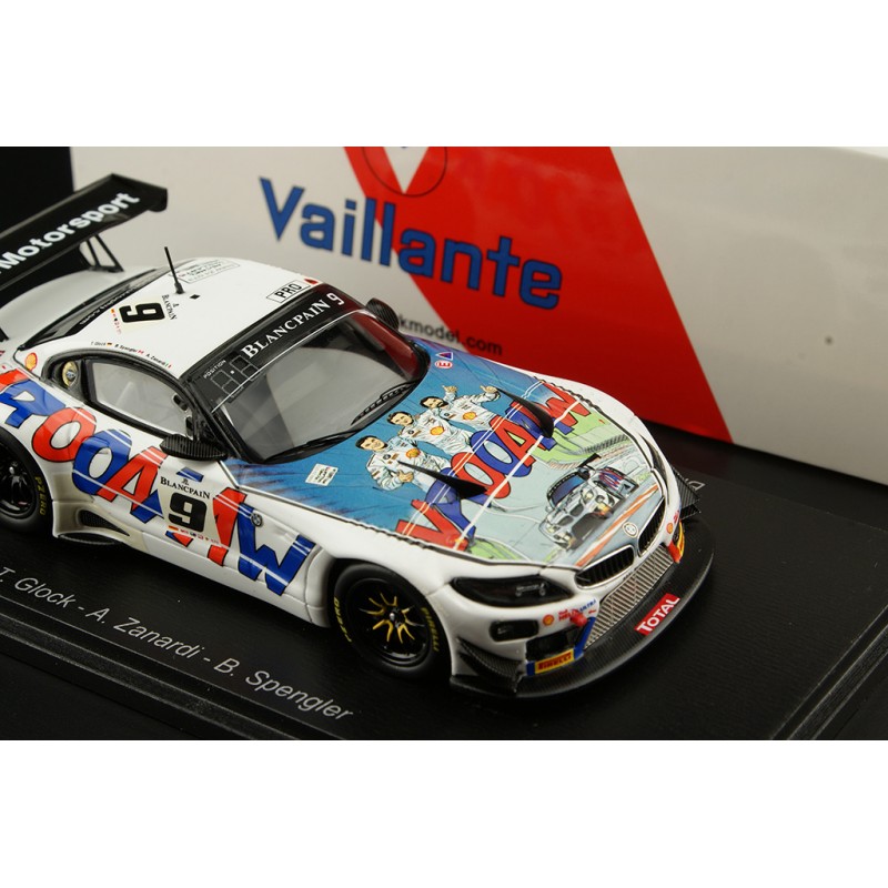 Miniature diecast car racing 1/43 de la BMW Z4 GT3 n 9 pilotée par Glock - Zanardi - Spengler aux 24 Heures de Spa Francorchamps 2015. Collection Michel Vaillant. Limited Edition 500 pcs. Modèle réduit de voiture Spark MV05. Catalogue Miniatures automobile Spark 2022. Maquette auto de collection.