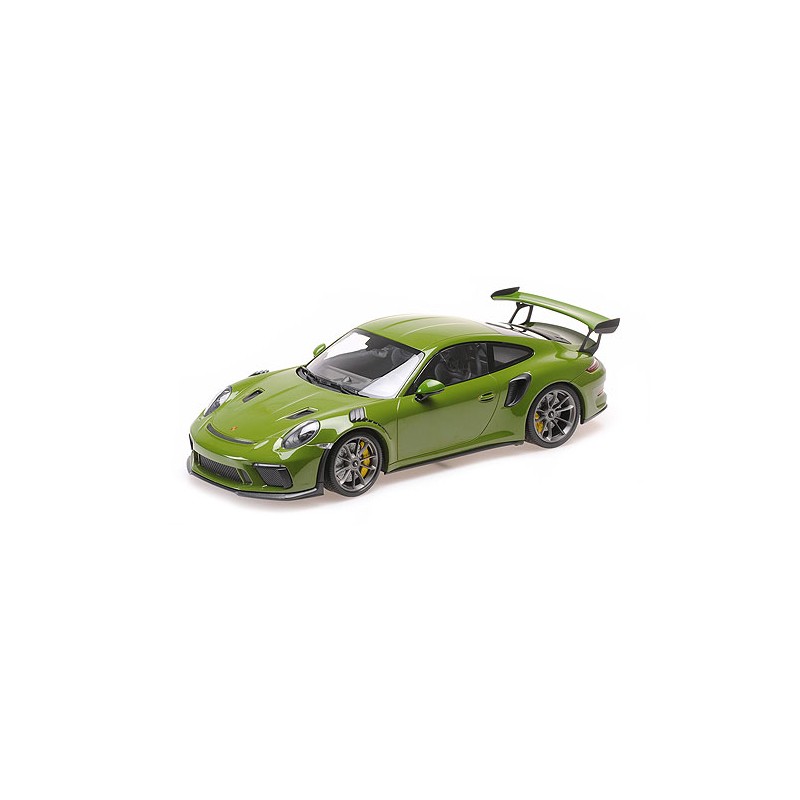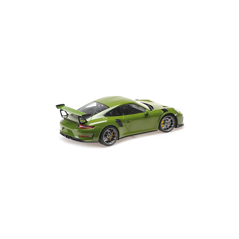 Miniature diecast car 1/18 de la Porsche 911 GT3RS (991.2) année 2019 couleur Green with Silver wheels. Modèle réduit de voiture Minichamps 155068234. Catalogue Miniatures automobile Minichamps 2022. Maquette auto de collection.