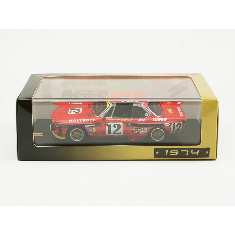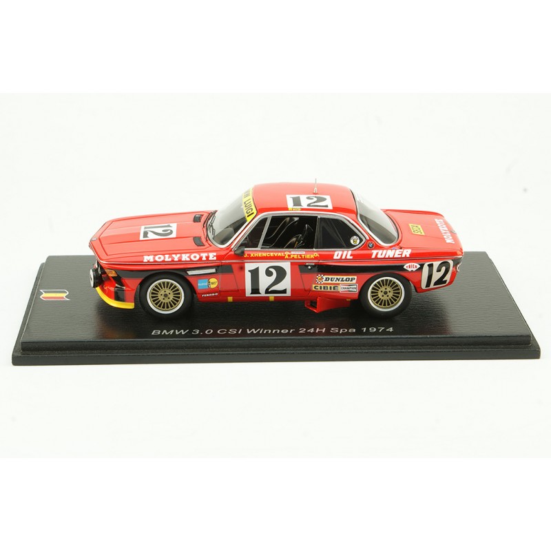 Miniature diecast car racing 1/43 de la BMW 3.0 CSI n 12 pilotée par Xhenceval - Peltier - Dieudonné aux 24 Heures de Spa Francorchamps 1974. Winner. Modèle réduit de voiture Spark 43SPA1974. Catalogue Miniatures automobile Spark 2024. Maquette auto de collection.